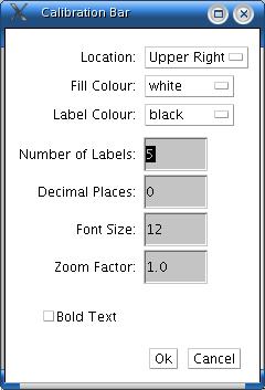Change Location to move the calibration bar. If there is a selection, the bar is initially drawn at the selection. Change Fill colour to adjust the bar's background colour. Change Label colour to adjust the text colour. Change Number of Labels to adjust the total number of values displayed. Change Decimal Places to adjust the number of decimal places present in the labels. Change Font Size to adjust the labels' font size. Change Zoom Factor to scale the entire calibration bar. If Bold Text is checked, labels are drawn bold.