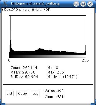 Calculates and displays a histogram of the distribution of gray values in the active image or selection. The x-axis represents the possible gray values and the y-axis shows the number of pixels found for each gray value. The total pixel count is also calculated and displayed, as well as the mean, modal, minimum and maximum gray value.