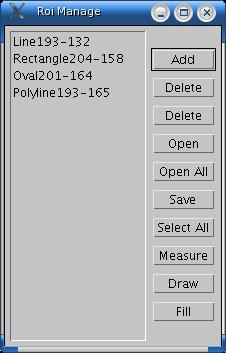 Click Add to add the current ROI to the list. Click Delete to delete the selected ROIs from the list. Click Open to open an ROI file and add it to the list. Click Open All to open all the ROI files in a folder and add them to the list. Click Save to save the selected ROIs as files. Click Measure to measure the selected ROIs. With a stack, a dialog box allows the user to choose between measuring all of the images in the stack or only the current slice. Click Draw to draw outlines of the selected ROIs using the current foreground colour and line width. Click Fill to fill the selected ROIs with the current foreground colour. Click in the Image/colours window to set the foreground colour. Use Edit/Options/Line Width to set the line width.