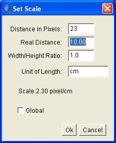 Use this dialog to define the spatial scale of the active image so measurement results can be presented in calibrated units, such as millimeters. Before using this command, use the straight line selection tool to make a line selection that corresponds to known distance. Then, bring up the Set Scale dialog, enter the known distance and unit of measurement, then click OK. SalsaJ will have automatically filled in the Distance in Pixels field based on the length of the line selection.