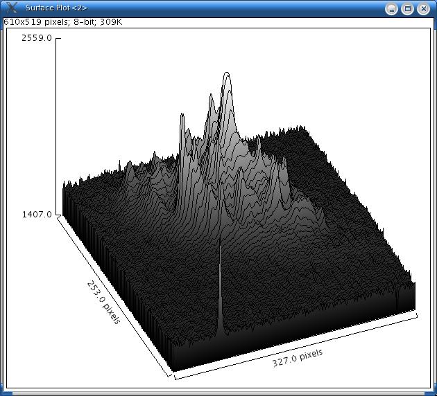 Displays a three-dimensional graph of the intensities of pixels in a grayscale or pseudo colour image. Creates a stack of plots when the source is a stack. Some plots can be improved by adjusting the contrast of the source image or smoothing it. When plotting a stack, closing the plot stack window will abort the plotting process.Change the Number of samples to adjust the number of profiles used to generate the plot. Check Draw Wireframe to have the outline each profile drawn in black. Check Shade to generate a shaded plot. The plot will be in colour if the source image uses a colour LUT. Check Draw Axis to have the three axis drawn and labeled. If Source Background is Lighter is checked, lighter areas in the source image represent lower elevations (valleys) while darker areas in the source image represent higher elevations (peaks). If Fill Plot Background with Black is checked, the plot is drawn with a black background.